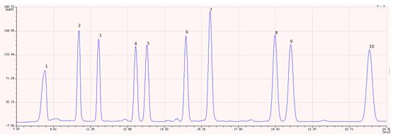 圖2.多溴聯(lián)苯標(biāo)準(zhǔn)樣品色譜圖