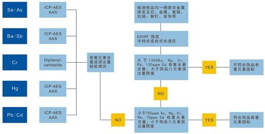 另外XRF由于只是測(cè)試元素的總含量,而無(wú)法進(jìn)行溶出量的檢測(cè),我們可以通過(guò)XRF測(cè)試元素總量是否超過(guò)了溶出量最大限量,如果超過(guò)溶出量最大限量,則必須通過(guò)其他光譜分析檢測(cè)設(shè)備(如ICP、AAS)來(lái)確定元素的溶出量是否超過(guò)了最大限量,所以如果要全方位的解決飾品中有害元素檢測(cè)解決方案,單只靠XRF是無(wú)法全部做到的,還要進(jìn)行其它分析測(cè)試,下圖表示XRF檢測(cè)飾品有害元素的篩選性初檢分析方法: