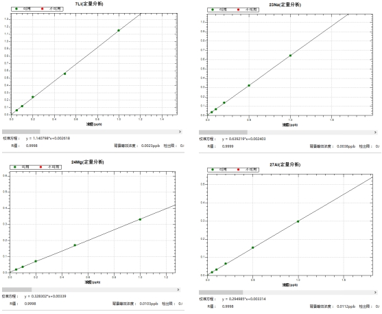 冷焰模式下,繪制各元素0,0.05,0.1,0.2,0.5,1.0μg/L系列濃度標(biāo)液工作曲線,39K、40Ca、56Fe等同位素的線性相關(guān)系數(shù)r均大于0.999,背景等效濃度為0.0023μg/L~0.0217μg/L。