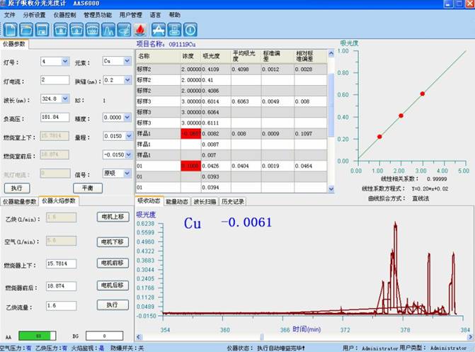 樣品測(cè)試:于原子吸收光譜儀波長(zhǎng)324.8nm處,使用空氣-乙炔火焰,以水調(diào)零,測(cè)量試液的吸光度,減去隨同試料的空白試驗(yàn)溶液的吸光度,從工作曲線(xiàn)上查出相應(yīng)的銅濃度。