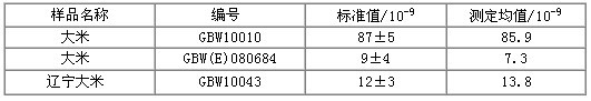 選用三種國家標準大米樣品進行樣品消解及樣品測試,測試結果如表1所示: