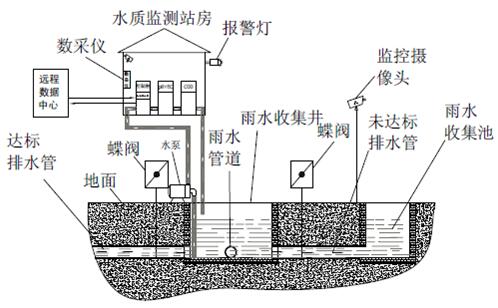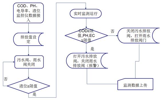 監(jiān)測系統(tǒng)控制采樣單元將水樣導(dǎo)入監(jiān)測室,并啟動(dòng)監(jiān)測水質(zhì)的COD、pH、電導(dǎo)率等常規(guī)參數(shù)。達(dá)標(biāo)雨水通過電控閥門排入市政雨水管網(wǎng),一旦超標(biāo)電控閥門關(guān)閉,禁止雨水排入市政雨水管網(wǎng),并通過水泵將超標(biāo)雨水泵入企業(yè)污水處理系統(tǒng)處理,達(dá)標(biāo)后排放至市政污水管網(wǎng)。同時(shí)所有監(jiān)測數(shù)據(jù)經(jīng)由數(shù)據(jù)采集單元將數(shù)據(jù)統(tǒng)計(jì)后,由傳輸設(shè)備傳輸至企業(yè)監(jiān)測中心或環(huán)保局,由此完成對雨水排放自動(dòng)、實(shí)時(shí)、連續(xù)監(jiān)控。