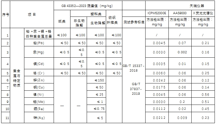 針對剛正式實施的快遞包裝首個國標(biāo),參考GB43352標(biāo)準(zhǔn),采用ICP-MS2000E測定快遞塑料包裝袋中鉛汞鎘鉻等十項金屬元素,各元素檢出限在0.012~0.097μg/L,加標(biāo)回收率在94.4%~102.2%之間,精密度在1.15%~6.60%之間;各元素測量值均在國標(biāo)要求的限值范圍內(nèi)。本實驗結(jié)果表明該方法具有良好的穩(wěn)定性及精密度,完全滿足快遞塑料包裝袋中重金屬元素的測定。