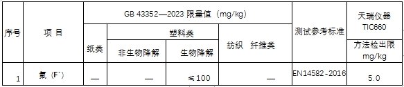參照EN14582-2016標(biāo)準(zhǔn),樣品用氧彈燃燒儀燃燒后冷取、定容,經(jīng)0.22μm水系濾膜過濾后,用天瑞儀器離子色譜儀TIC660進行測試,以保留時間和色譜峰進行定性,外標(biāo)法進行定量;方法檢出限5.0mg/kg,加標(biāo)回收率為106%。通過本實驗結(jié)果表明,該方法檢出限低、靈敏度高、穩(wěn)定性好、方法回收率高,且前處理方法簡單,可滿足快遞外包裝袋中氟離子的測試需求。