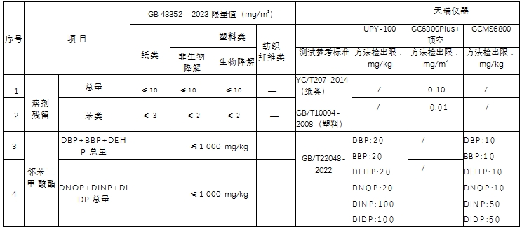 表 5. 溶劑殘留、鄰苯二甲酸酯類物質(zhì)限量及檢測一覽表