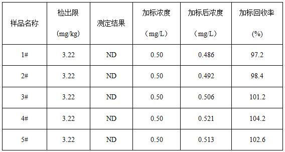取5種不同顏色的涂層試樣,各稱取0.2g(精確至0.0001g),采用氧彈燃燒后冷卻定容,經(jīng)0.22μm的水系濾膜過濾后上機得到樣品譜圖,如下圖3所示,5種涂層試樣的測定結(jié)果均低于方法檢出限,同時對5種試樣進行了加標處理,加標回收率在97.2%~104.2%之間。測試數(shù)據(jù)詳見表2。