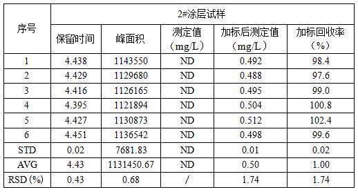隨機抽取2#涂層試樣進行加標0.5mg/L重復(fù)測定6次,考察了保留時間、峰面積的重復(fù)性及加標回收率,其中保留時間的重復(fù)性(RSD)為0.43%,峰面積的重復(fù)性(RSD)為0.68%,加標回收率的重復(fù)性(RSD)為1.74%,測試結(jié)果詳見表3所示。