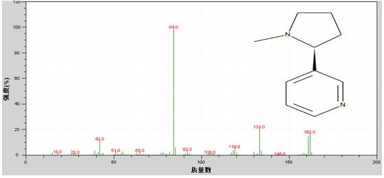 尼古。Nicotine),俗名煙堿,是一種存在于茄科植物(茄屬)中的生物堿,也是煙草的重要成分之一。尼古丁會使人上癮或產(chǎn)生依賴性,重復(fù)使用可導(dǎo)致心臟速度增加、血壓升高和食欲降低,攝入大劑量尼古丁會引起惡心甚至嘔吐,嚴重禍及死亡。氣相色譜質(zhì)譜聯(lián)用儀(GCMS),采用氣相色譜分離和電子轟擊電離源(EI)配合全掃描模式完成定性分析,GCMS-SIM模式實現(xiàn)定量分析,可應(yīng)用于煙草中尼古丁的檢測。