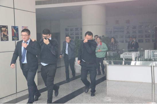 本次演練由公司總經理應剛擔任總指揮。演練共設置了警械疏散組、通訊聯(lián)絡組、搶修搶險組、物資供應組、醫(yī)療救援組五個組。下午2點,各小組準備完畢后,演練正式開始。根據演練預案,公司四樓倉庫發(fā)生了火災,剎那間煙霧彌漫;馂膱缶到y(tǒng)的警報聲驟然響起,大樓內全體員工聽聞報警聲后迅速切斷電源,在各部門負責人的組織下,沿著大樓樓梯向樓下跑去,迅速逃離火場。整個過程井然有序,五分鐘的時間,大樓內工作人員全部逃離火災現場,接著參加在公司門口空地舉行的滅火演練。