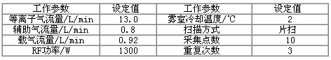 以10.0ng/mL Li 、Co 、In 、Ce 、U 和Bi混合調(diào)諧液優(yōu)化儀器工作參數(shù),使儀器靈敏度最佳,同時確保氧化物及雙電荷產(chǎn)率低于3%,具體工作參數(shù)見表1。在儀器最佳工作參數(shù)條件下,以內(nèi)標法進行測試。