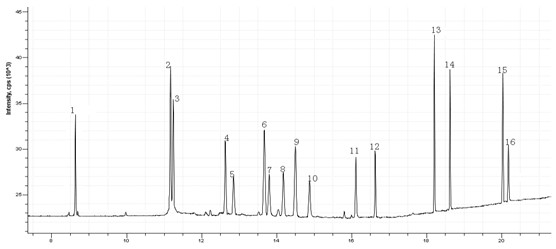 圖1. 16種有機磷標(biāo)準(zhǔn)溶液TIC圖