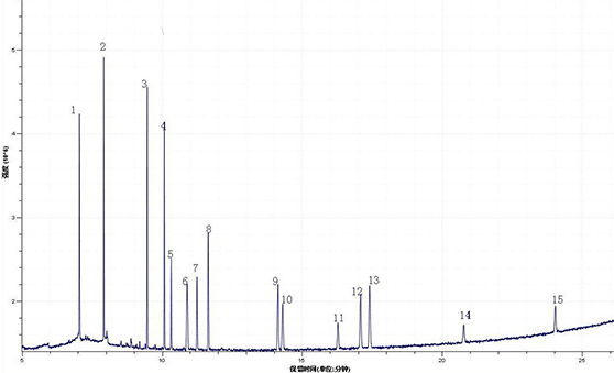 3.1 15種塑化劑混合標(biāo)準(zhǔn)溶液總離子流監(jiān)測圖(TIC)如下所示: